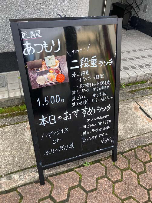 お昼時にコンビニに行く途中前を通った時に、ランチメニューが出されていて、新しく開店したんだと初めて知ったお店です。「居酒屋 あつもり」