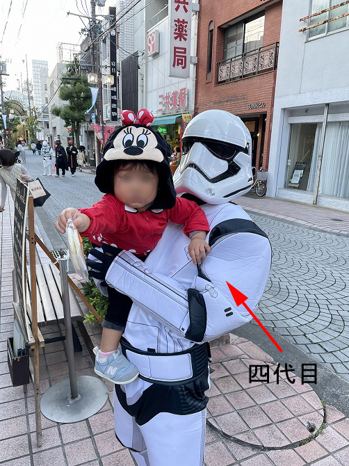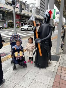 以前は6名の商店主の協力があり、ストームトルーパー3名、ダースベイダー1名、ジャワ星人1名、ダースモール1名に仮装して「スターウォーズ軍団」として、みとのまちハロウインを盛り上げていたのですが、諸事情により四代目一人だけの仮装となってしまいました。