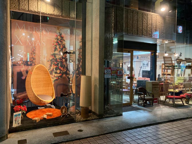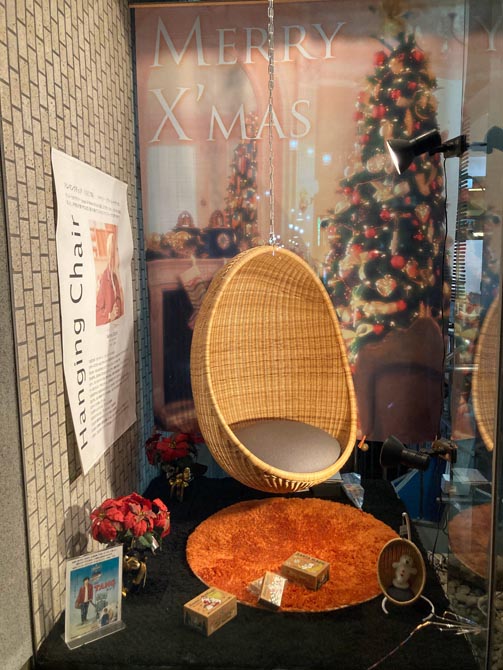 安田屋家具店のウインドウディスプレイを「クリスマスバージョン」にしました。展示商品はロングセラーの「ハンギングEggチェア」です。