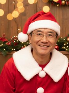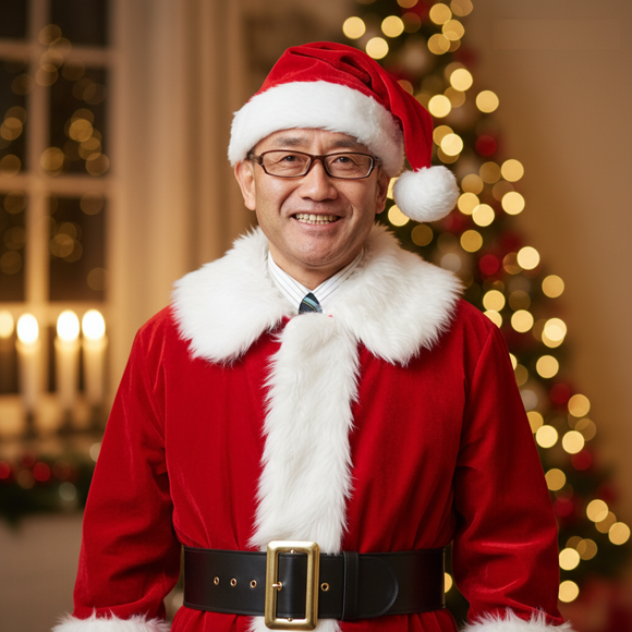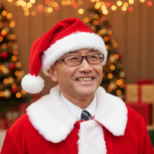 「この人物をサンタクロースにする」と打ち込んで作成されたプロンプトを「DALL-E(ダリ)」で画像化しました。1分程度でサンタクロースに変身です。