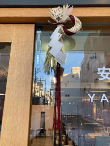お正月に見るこの光景は、人、人、人で埋め尽くされていることでしょう。安田屋家具店に戻り、flower factory「LAZO」さんで作ってもらったしめ飾りを入口に飾ります。
