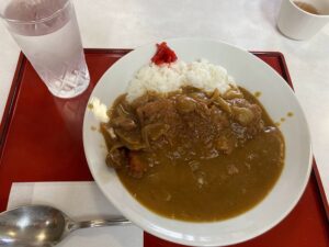 「カツカレー」は大衆食堂の懐かしいカレーの味でした。カツの量は多く食べ応えあります。