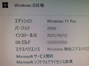 作業手順通り行ってみると、途中何回か作業ミスでうまくいかず、やはりダメかと思ったものの、再三再四作業マニュアルを確認したら、意外と簡単にWindows 11proにアップデートできちゃいました。バージョンは最新の25H2。