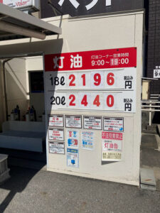 このホームセンター昨冬時、一番安価で灯油販売していたところです。ここ最近、安田屋家具店では灯油を使用する事が無くなったので、あまり関係はないのですが、昔の価格からしたらかなり高騰してますね。