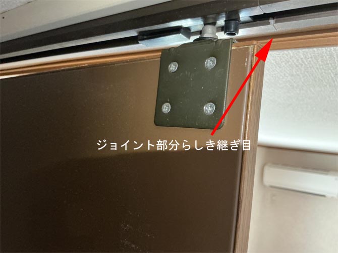 S様宅の金具とまったく同じ金具ではありませんが、その工場が仕組みがほぼ似た形状の昔の折り戸金具の場合から考えると、扉上部のローラー部品をはめ入れている上部のレールは「上レールジョイントレール方式」になっているとのことです。