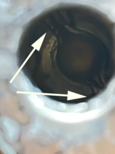 「両爪鍵」は、鍵棒の左右に羽が飛び出ている形状です。この羽に鍵の円筒部の切り欠き部分が挟まり、鍵が回る仕組みです。お送り頂いた写真の矢印の部分に羽根らしきものが見えますので、「両爪鍵」で良いと考えます。