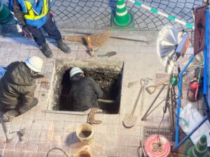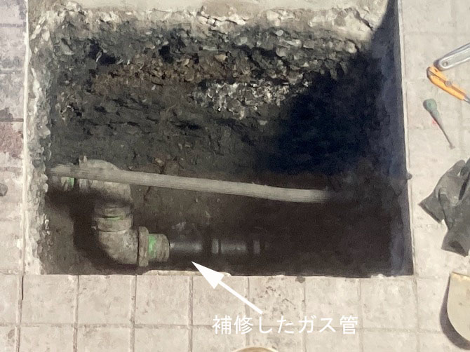 歩道タイルをカットし、ハツリ機器で歩道をめくり、で慎重にガス管に辿り着くまで手作業で掘っていった。寒空の中、朝10時から夕方5時ごろまで時間を要した。