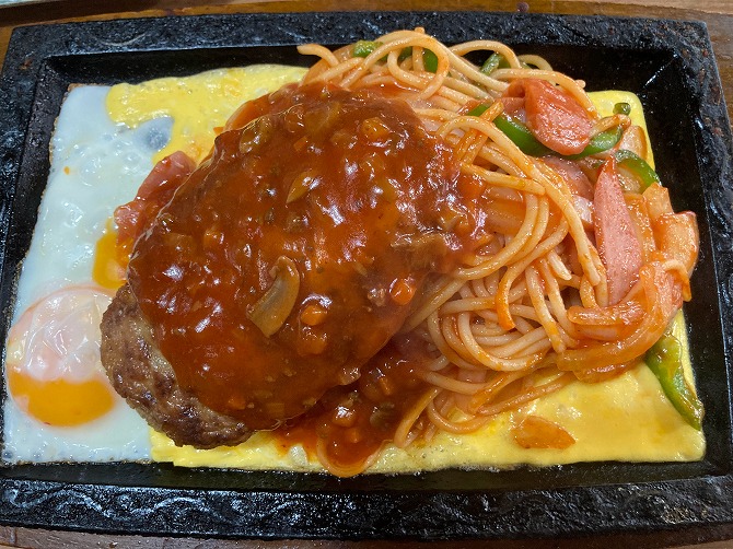 熱々の鉄板に、イタリアンスパゲッテイと、ハンバーグと、目玉焼きがのってます。イタスパの下には溶き卵が敷かれています。どれも熱々です。ご飯とみそ汁が付いた定食もあるようですが、今の四代目では食べきれません。