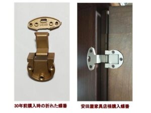本日、注文した蝶番が届き、早速取付しました。30年前に購入したテレビボードが、お陰様で復活いたしました。大事に使い続けたいと思います。ありがとうございました。同封の商店街のMAP、楽しく拝見しました。