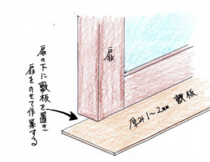 この時に扉の下に厚さ2.5mm程度の合板などを敷いて、その上に扉をのせた状態にします。この方法であれば、扉の下部と家具との間に合板材の厚み分の隙間が生じますので、扉が家具に当たることのない位置で取付ができます。